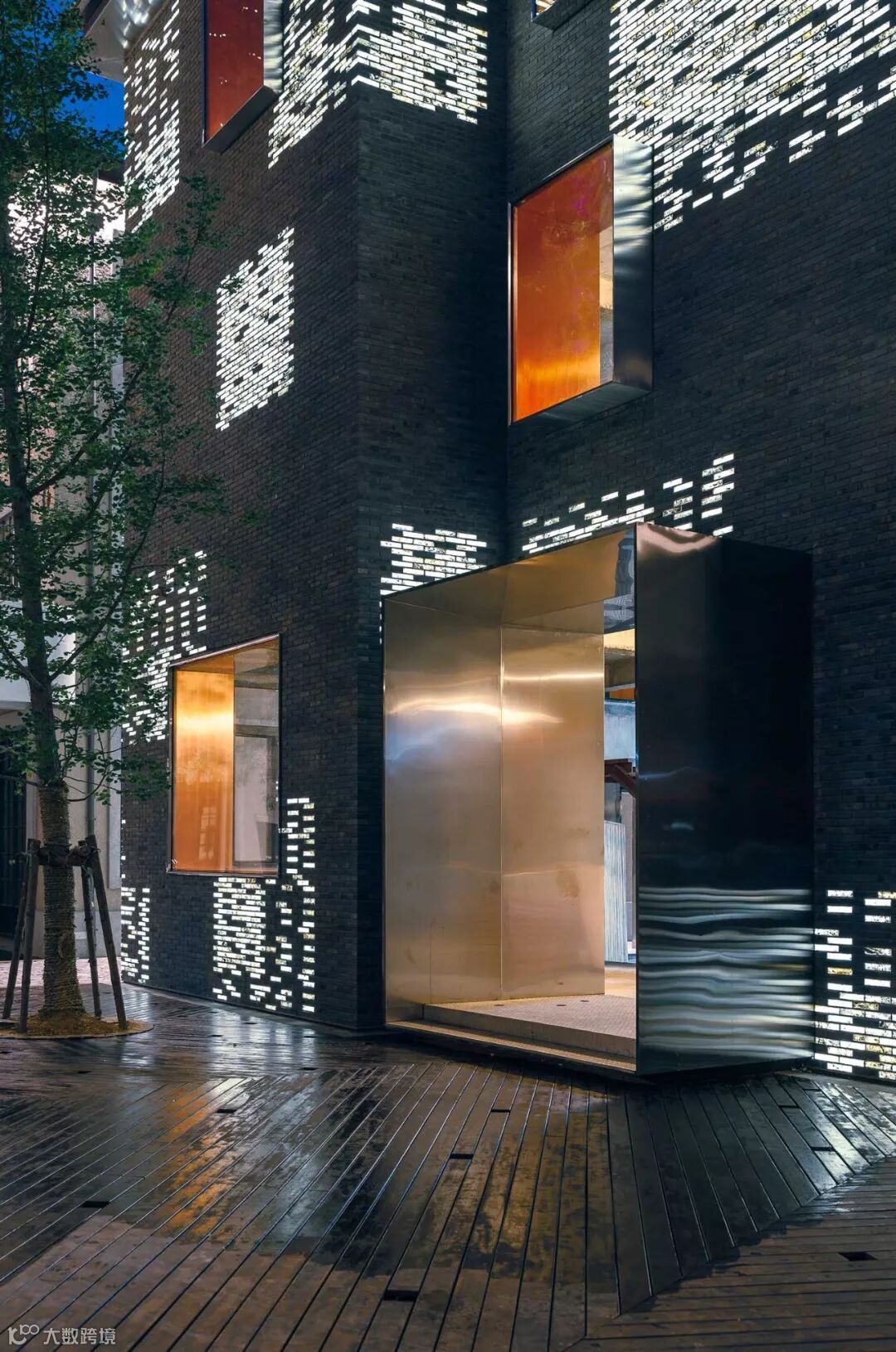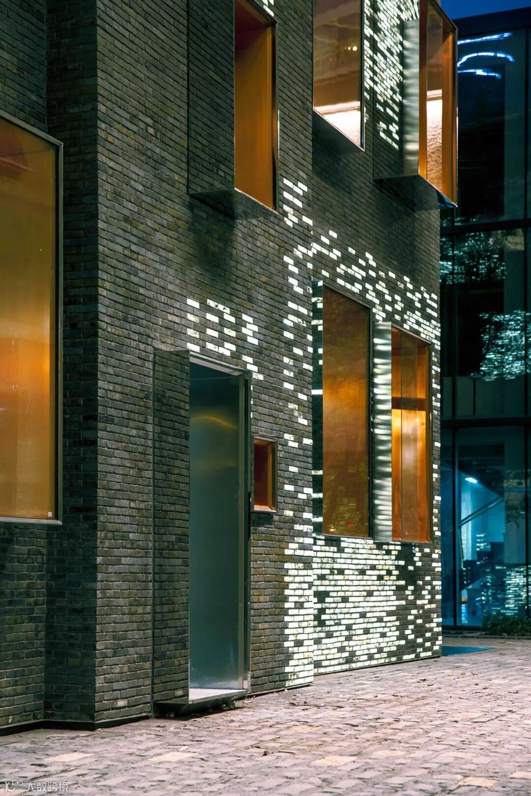 并且建筑师在玻璃砖后置了 LED 灯,到了夜晚便发出白色的冰冷光芒,质感十足 ▼
