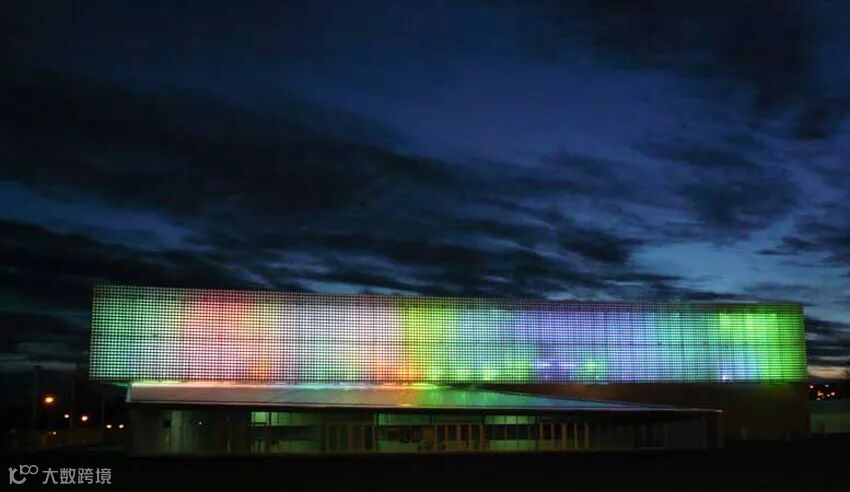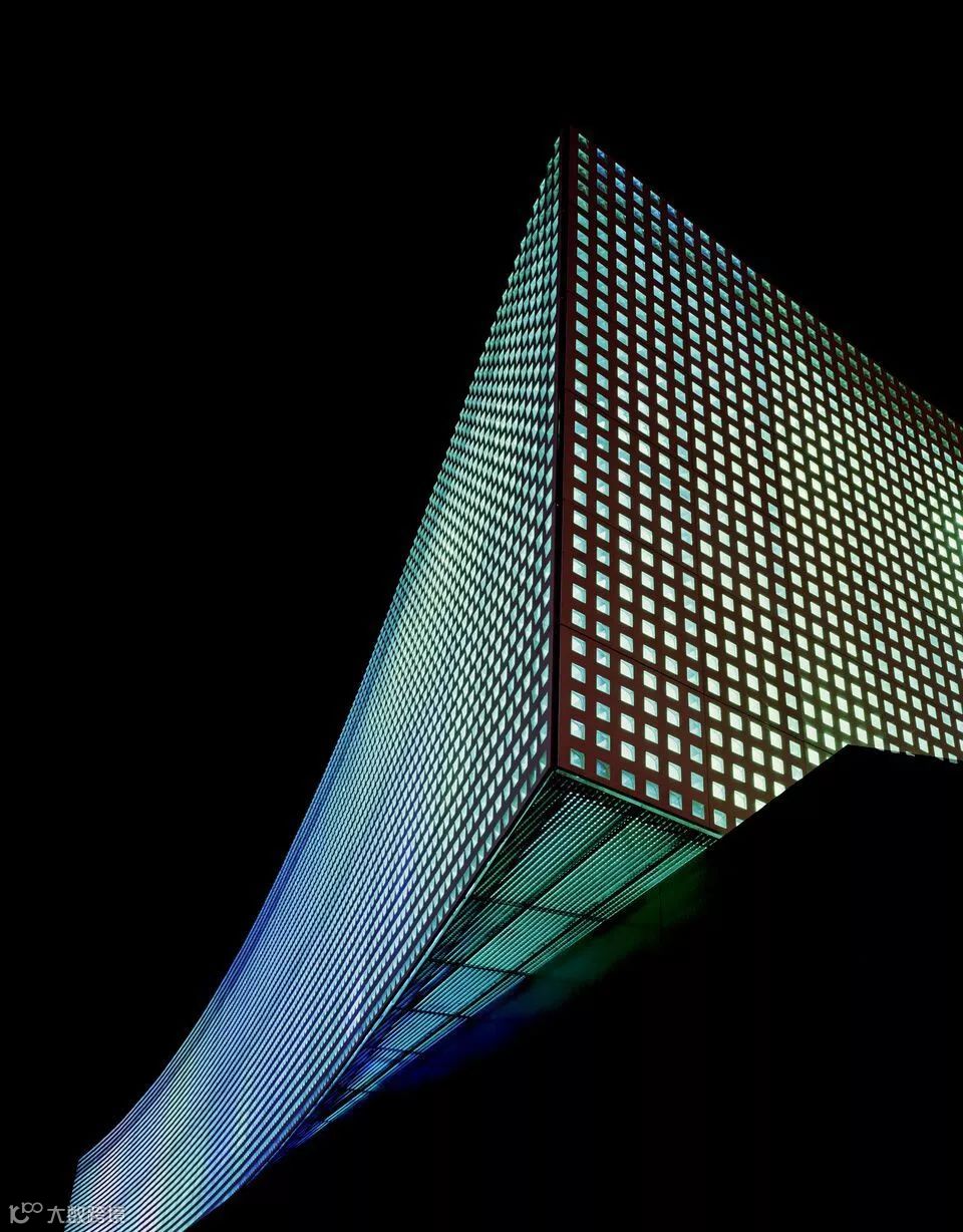 2007 年建成的音乐厅,通过在混凝土墙中置入特殊形状的玻璃砖,获得在夜晚可以发出五颜六色光彩的效果 ▼