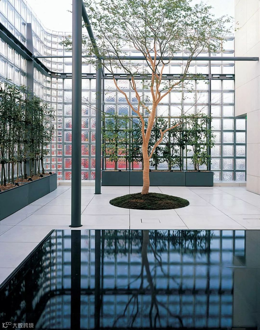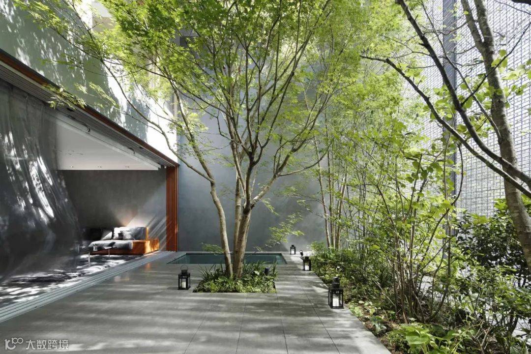 室内的庭院在玻璃砖透射进的光照下,绿意盎然 ▼