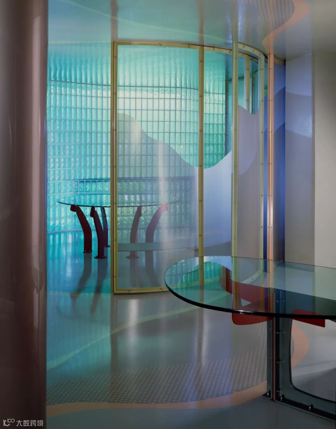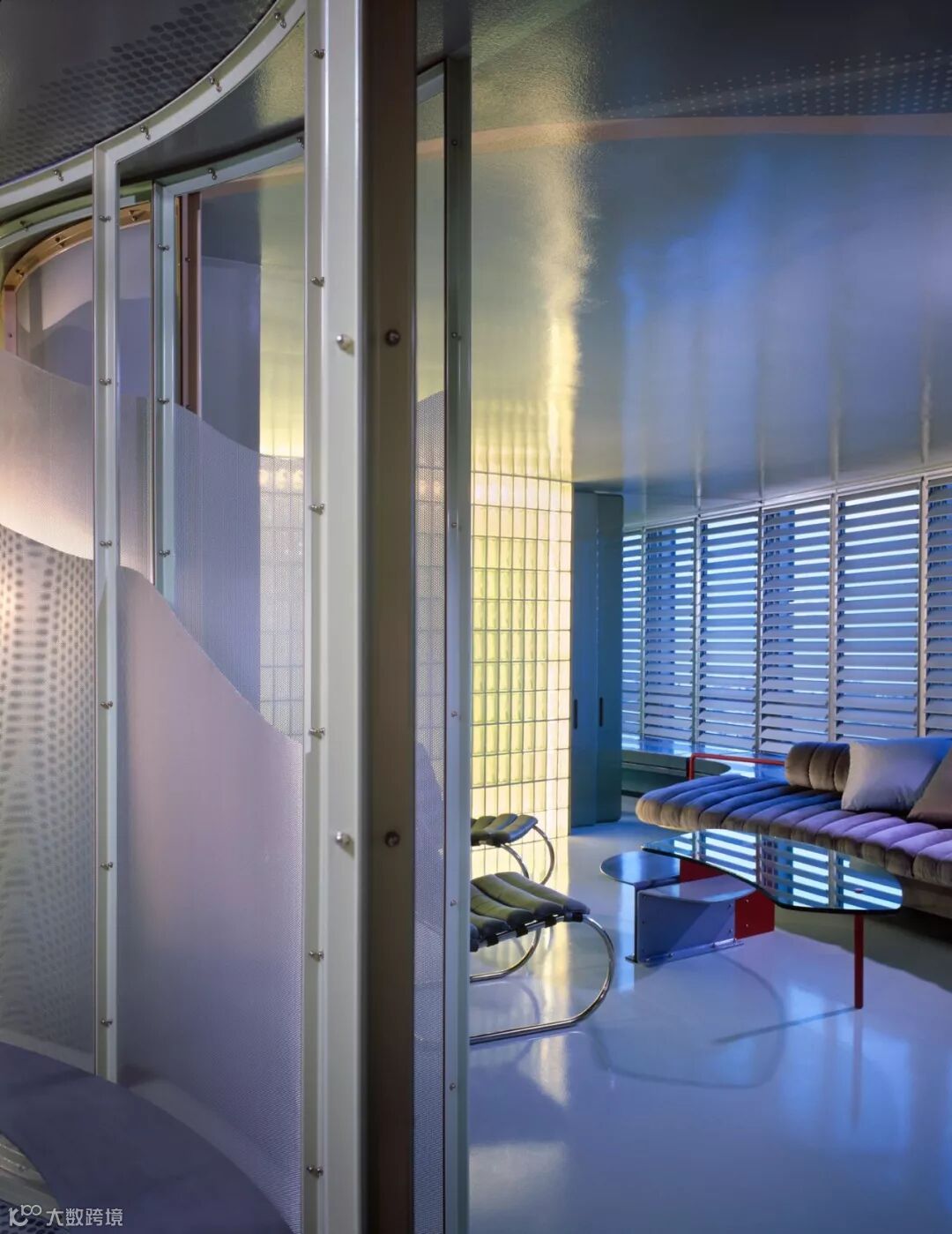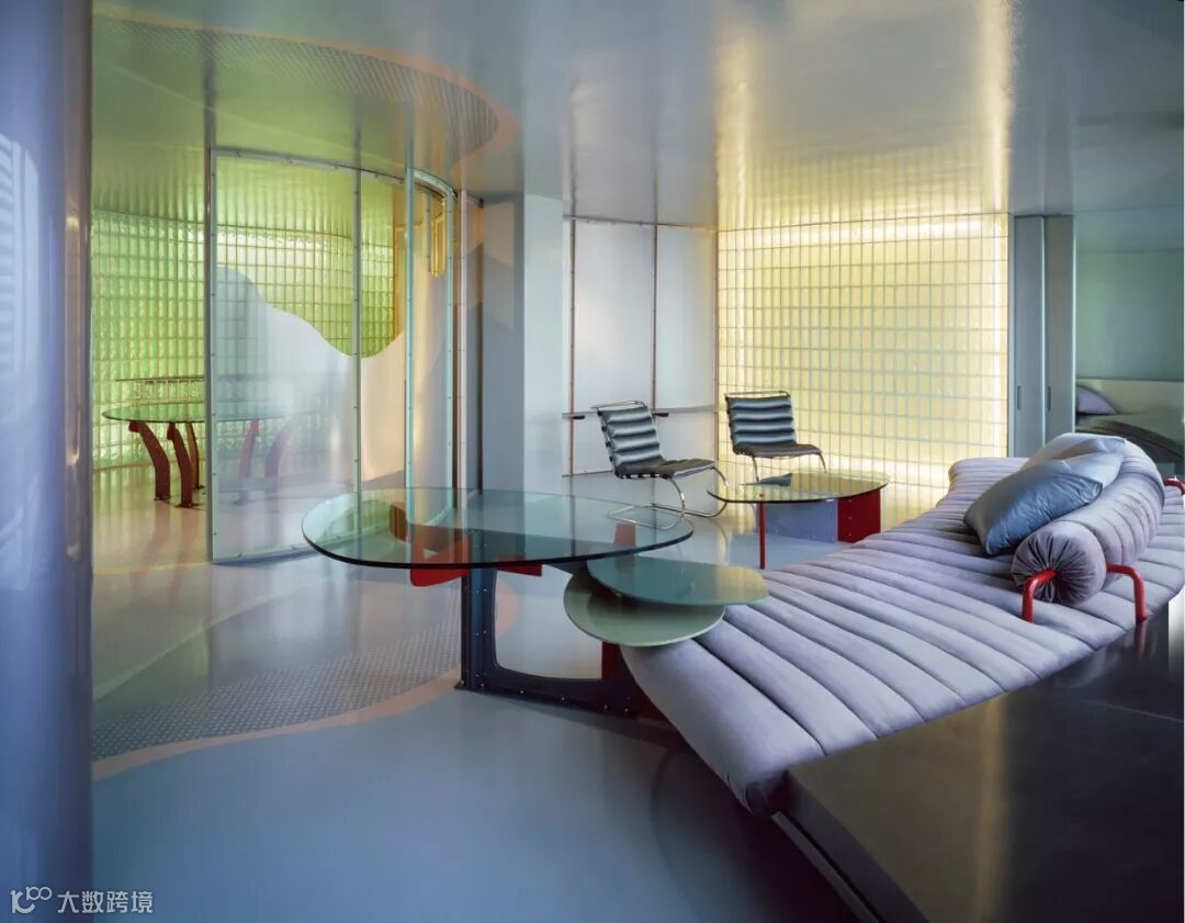 这是 1983 年的项目,在公寓室内设计了大量带有弧度的玻璃砖墙,并且通过不同颜色的灯光将墙面颜色一同转变。