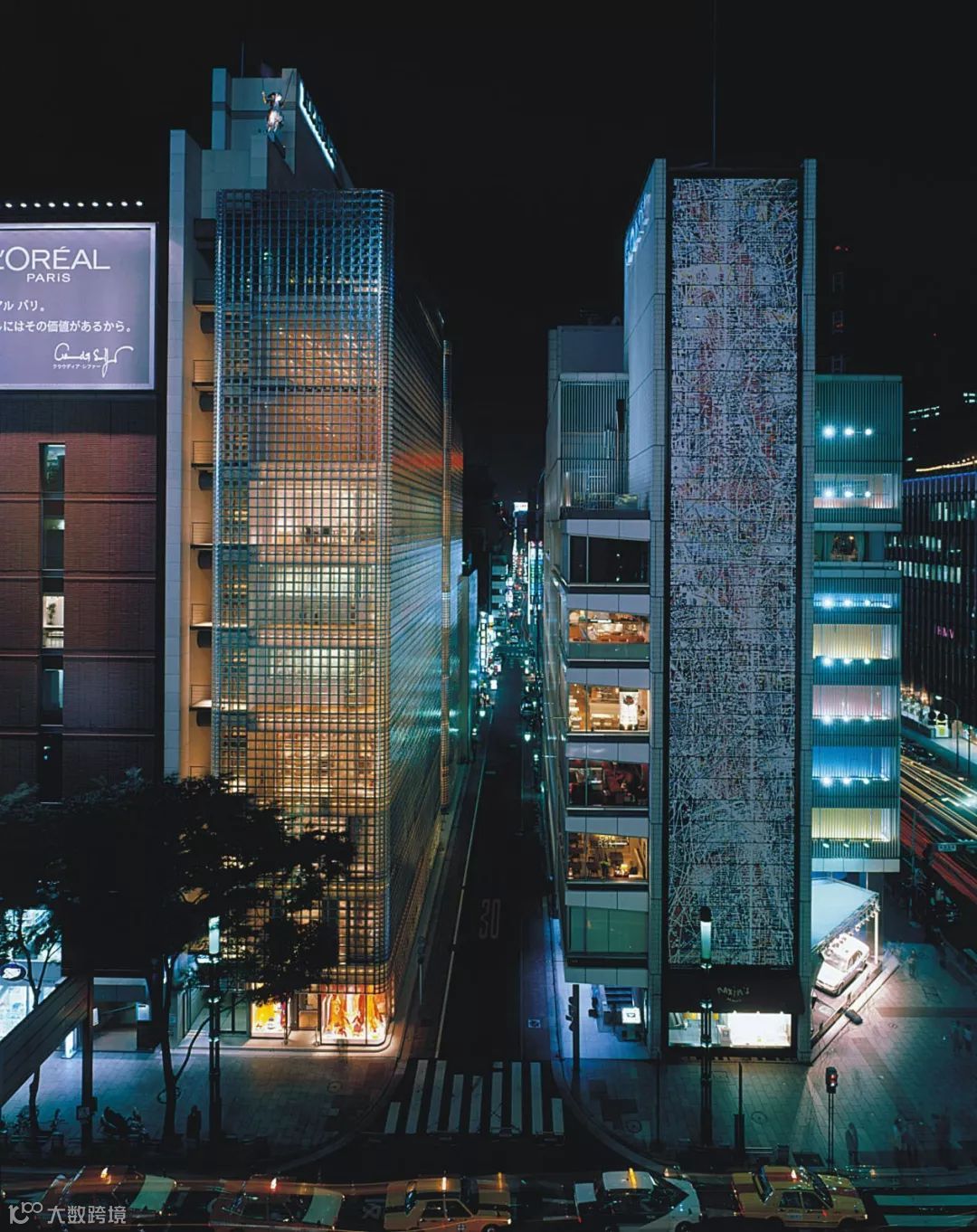 90 年代后期,奢侈品牌爱马仕还邀请了伦佐·皮亚诺设计了东京银座总部,用了整整 13000 个定制的方形玻璃砖构成建筑表面 ▼