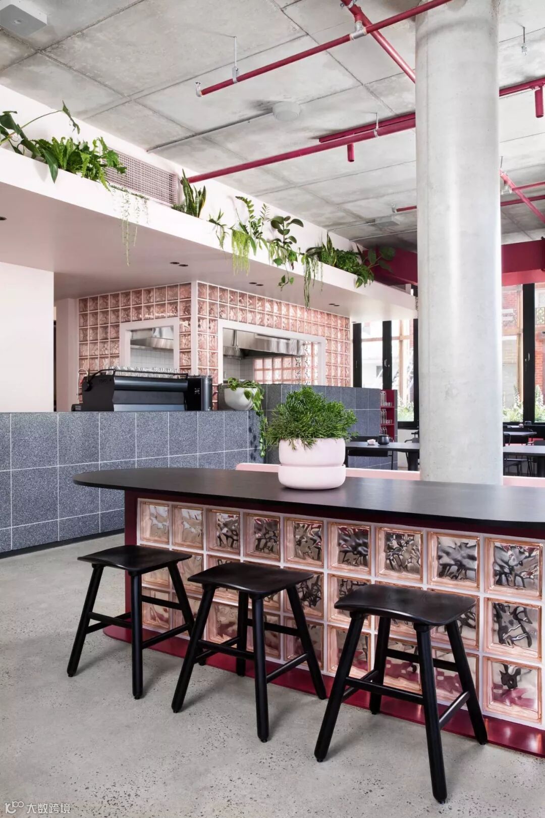 粉红色的玻璃砖搭建起厨房区域和部分会客区,让这个咖啡馆充满少女心 ▼