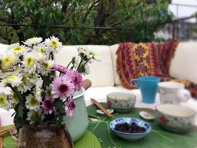 这个南漂妹子因为极爱饮茶,最后便连工作也来到广州做了相关的行业。她一直很想有个院子或者天台种花,喝喝下午茶,夜晚的时候看投影电影,现在终于实现了。