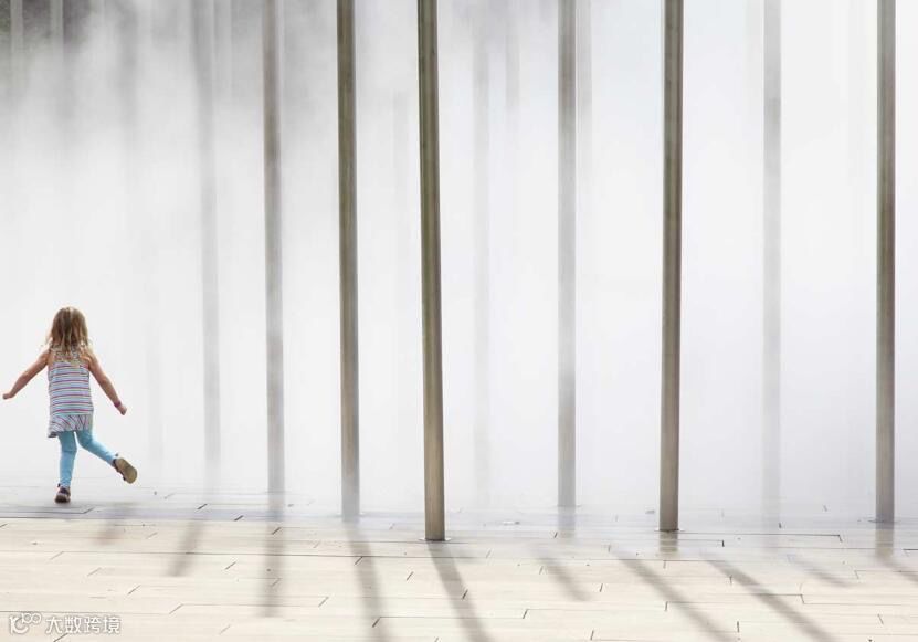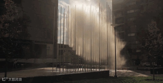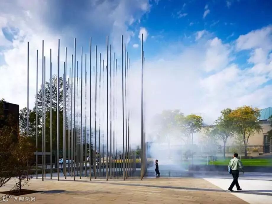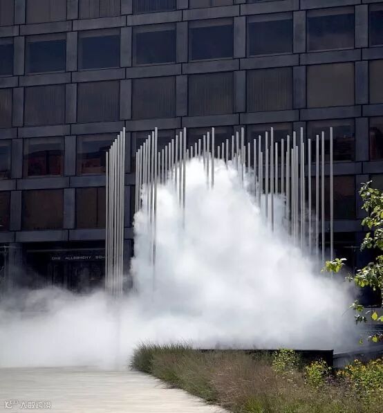 由30英尺高不锈钢柱列阵组成的“森林”和钢管高压喷出水雾行车的谁起云, 控制喷雾时间,形成时隐时现的“悬浮云”,有时为“流云”。实现自然与艺术的结合。