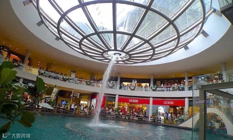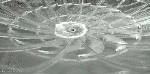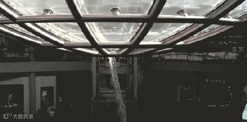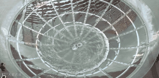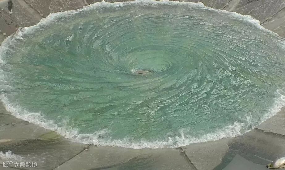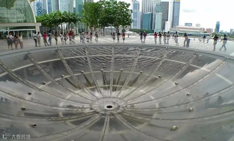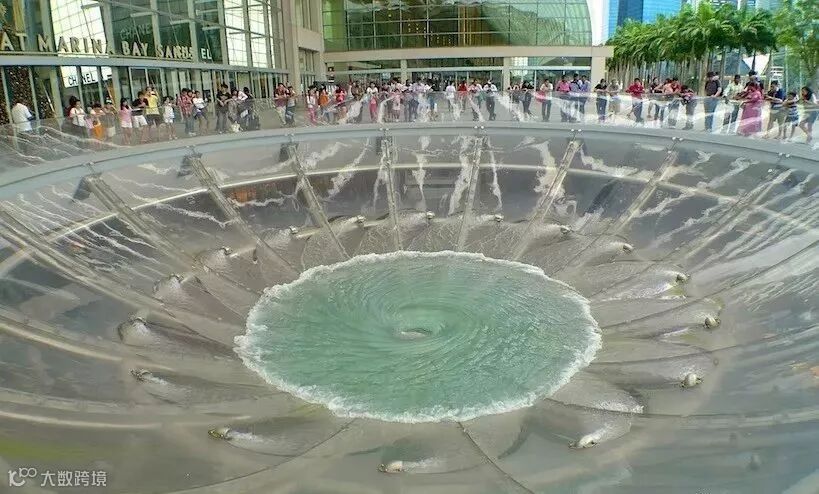 从地面看,这是一个巨大的漏斗形水容器,喷出的水流在玻璃容器形成一个巨大的漩涡!最后由中间的小孔流落下去。