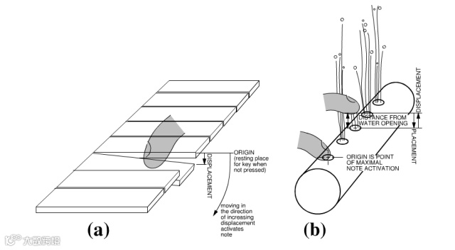 Water Flute与钢琴的发声原理有些许相似,两者都有一个类似键盘的排布,但影响钢琴发声的是按键的位移程度,而影响Water Flute发声的因素是一段时间内水量的积累。