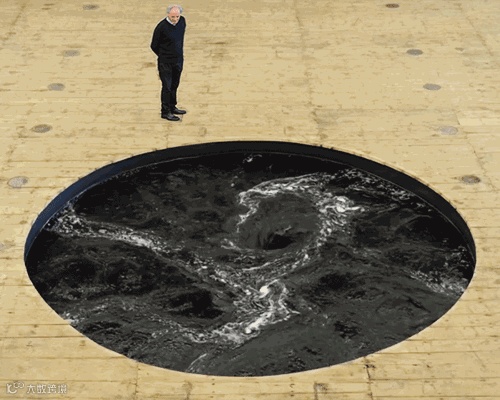 如果说还有什么东西比大路中间突然陷落形成的“天坑”更令人不安,那就是这天坑里还有一潭呼啸不停的黑色漩涡。它是著名印裔英国装置艺术大师Anish Kapoor的新作,名为“Descension”(坠落)。