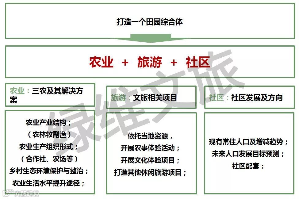 规划:重点考量由于田园综合体各要素的延伸,带动休闲产业发展,形成以农业为基础,休闲为支撑的综合产业平台,通过产业融合与产业聚集,引导人员聚集,形成当地农民社区化居住生活、产业工人聚集居住生活、外来休闲旅游居住生活等3类人口相对集中的居住生活区域,从而形成了依托田园综合体的新人口聚集区,构建了乡村的人口基础。