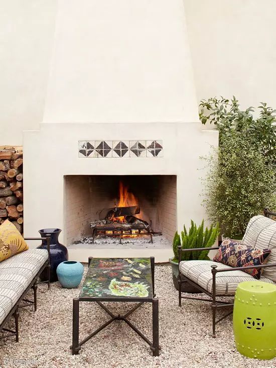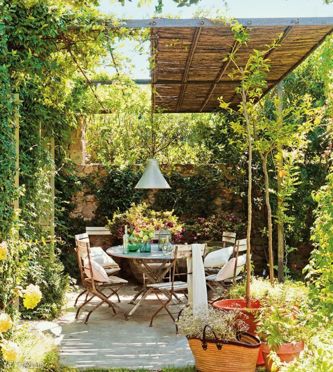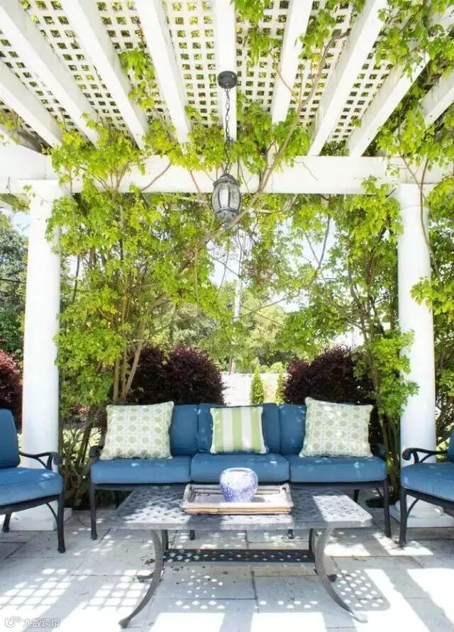 与其整个覆盖,不如只延伸到室外起居和娱乐空间的一部分,顶面也可以在地面上形成迷人的投影,在它的上面还可以悬挂一些盆花、风铃等装饰物。