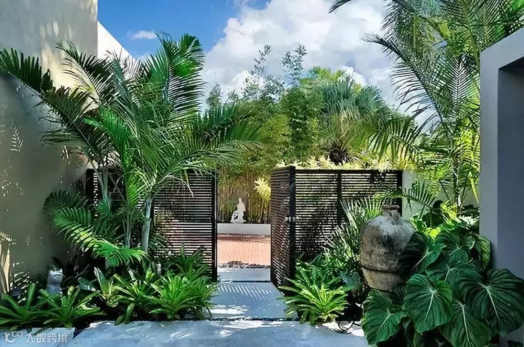 室外门厅应该表现出“好客”的意蕴,营造一种愉快的氛围。还应表现出亲切感,像室内居家一样,使用盆栽树、雕塑等来布置这个空间。