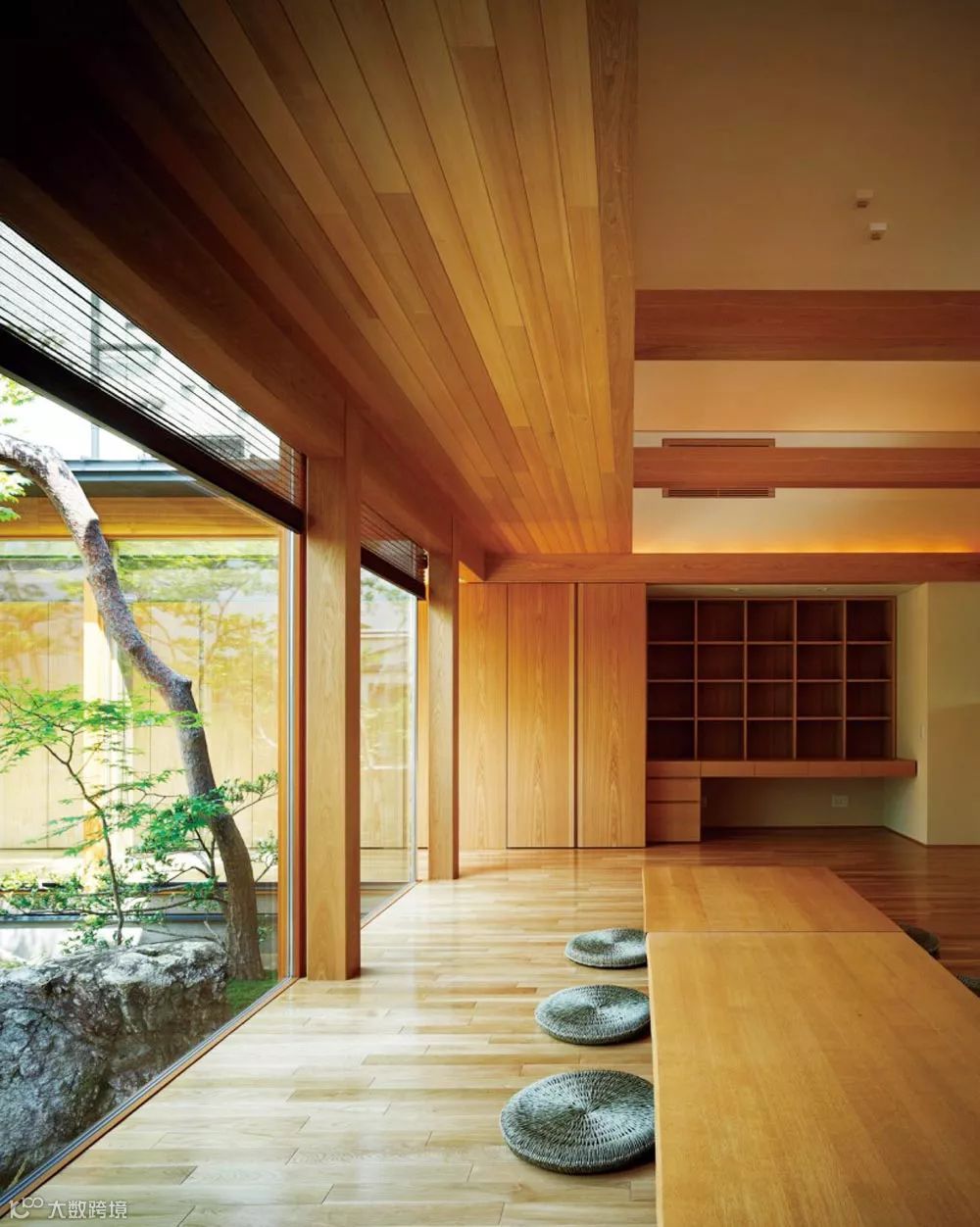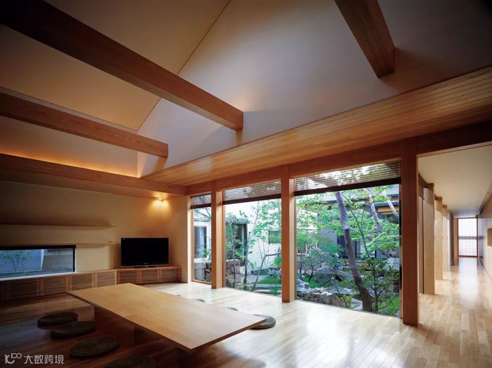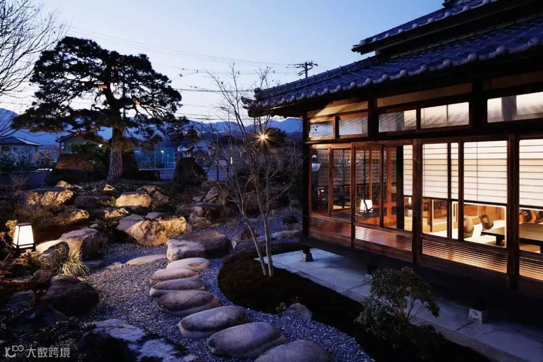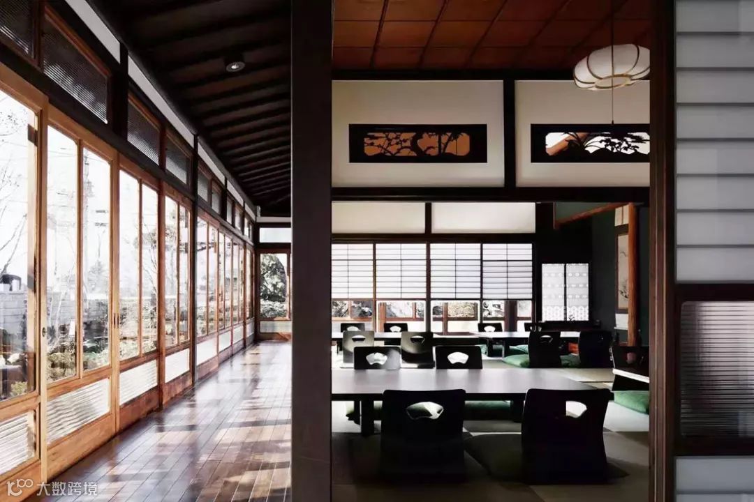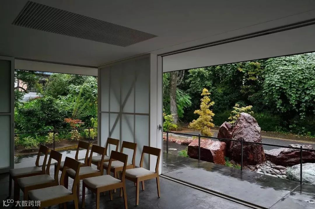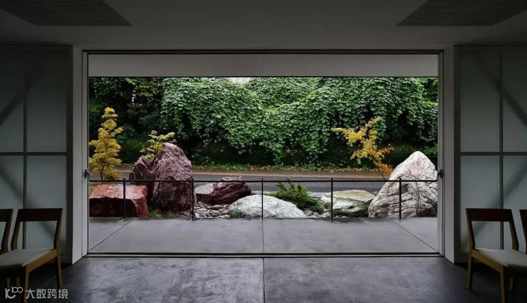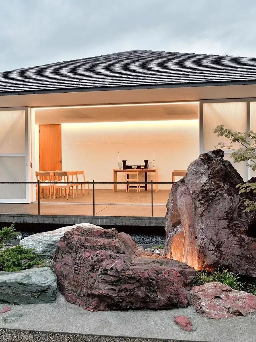 这室内是日本传统的设计手法,简单、整洁,全玻璃的门窗可以对外面的美景一览无余,门窗拉开就可以走进庭院,与这经历了百年的风雨的岩石近距离接触,感受自然的魅力。
