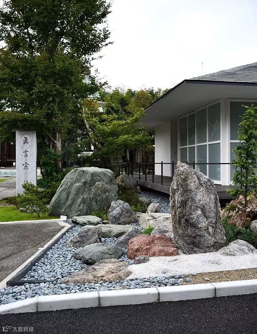 这在个寺院门口的禅意园林设计,运用了立石,白石,坐禅石头和绿石等,让它们在一起去营造一个壮观又肃穆的禅意镜。日本园林多使用竹子,叶子和石头等元素,去表达和阐述一种简约的园林艺术之美,把日本禅宗精神渗透到作品之中,体现了无形的记忆境界。传统日式庭园种类大致分为:筑山庭、枯山水庭和茶庭三大类,将东西方的文化融合后,让园林设计中以一种简约有意境的形式来表达主题。