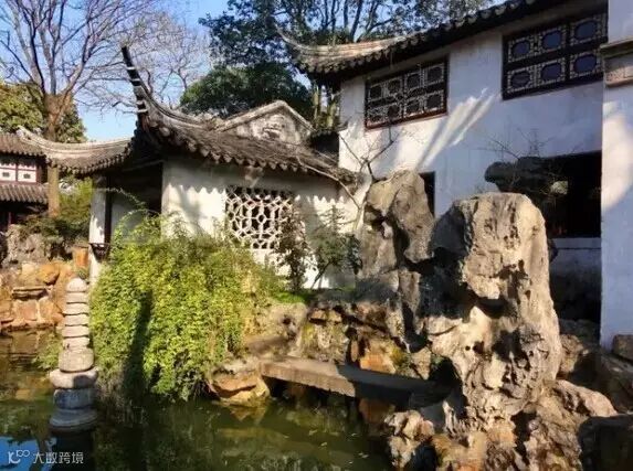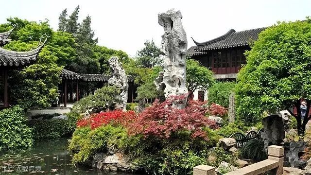 苏州留园冠云峰兼备瘦、皱、漏、透于一体,围绕冠云峰配置石榴、芭蕉、南天竹、枸杞等灌木,前植低矮的各色草花,游人驻足平台或漫步曲廊之中,但见湖石山峰高耸奇特、玲珑清秀,其旁植物花叶扶疏、姿态娟秀、苍翠如洗。与其说冠云峰一枝独秀,不如说在这些绿色的背景和前景鲜艳的暖色衬托下它早已经和这些植物共同构成了留园的象征。