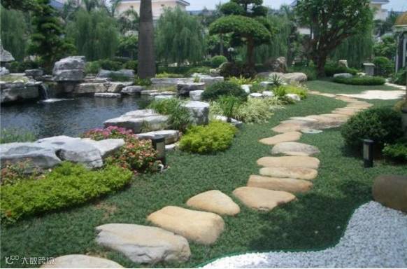 与古典园林相比,现代园林中的石材更多地融入了现代人追求简洁精练的风格。石材的品种在湖石、黄石、英石的基础上多用人工塑石、卵石。低矮的常绿草本植物或宿根花卉层叠疏密地栽植在石头周围,精巧而耐人寻味,良好的植物景观也恰当地辅助了石头的点景功能。