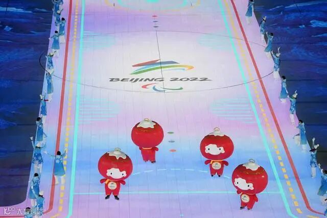 入场式被雪容融霸屏了,4个憨态可掬的雪容融滑入现场,带出两条冰雪赛道,全场呈现为一个冰雪赛场。