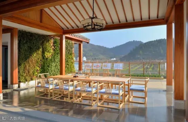 沿楼梯走上2层的合院,室内是朴素的装修,游廊下摆着露木的中式长桌。