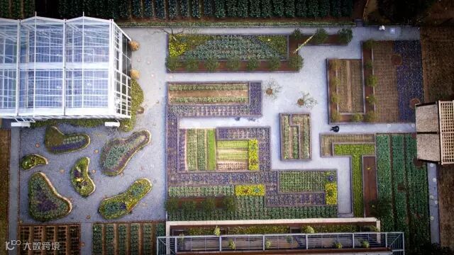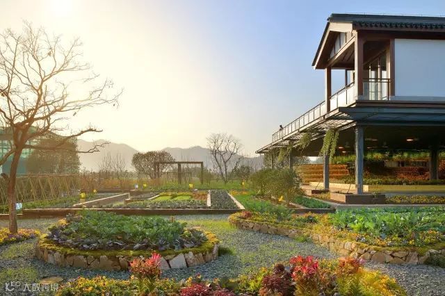 站在巨大的露台上,凭栏俯瞰,一派田园风光尽收眼底:从脚下的景观小院,蔬菜花园、迷宫和廊架,老树下的休憩区,到近处的玻璃暖房、生态泳池……