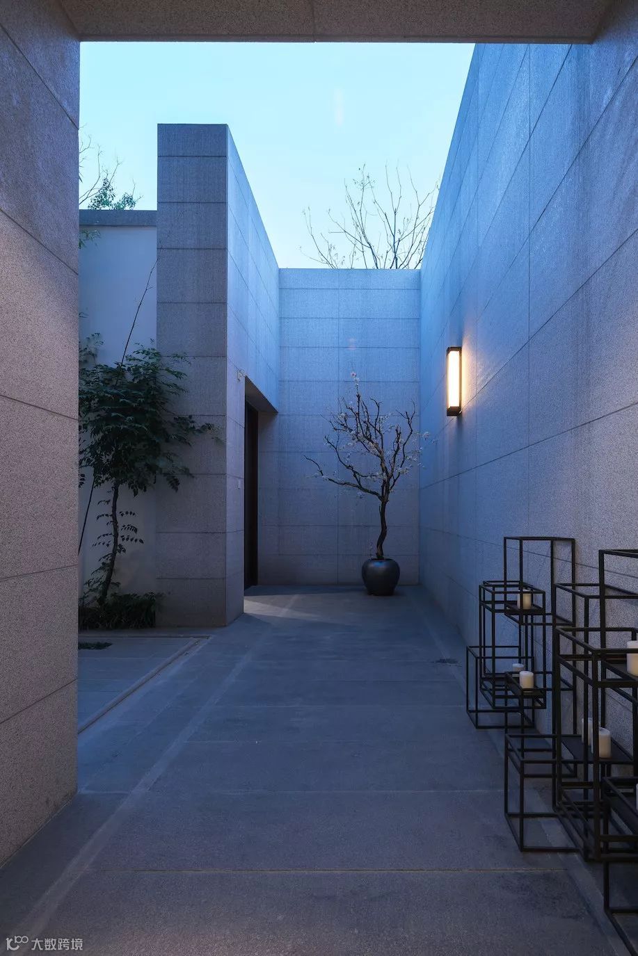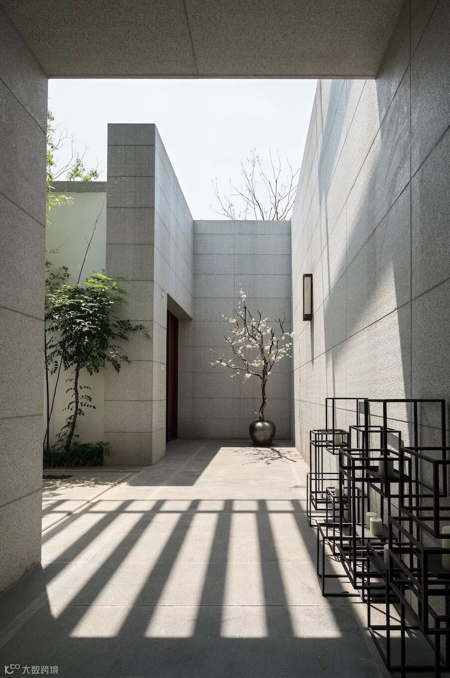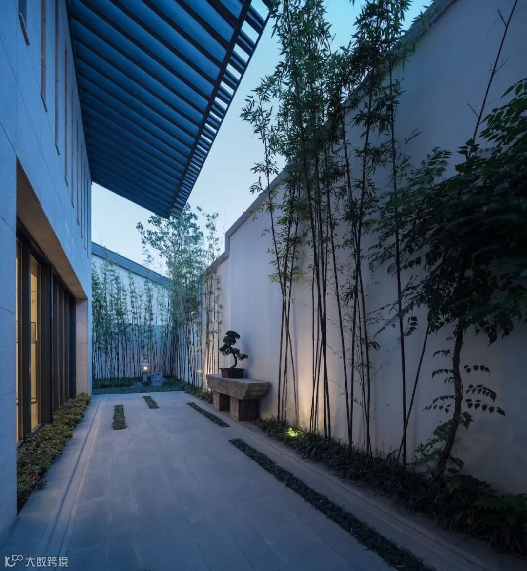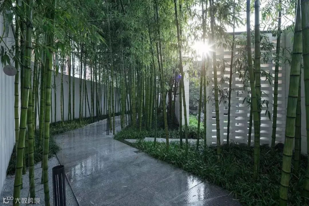 宁可食无肉,不可居无竹。转而入巷,取中国隐逸诗元素,竹。以石砖嵌绿草、白墙配丛竹、案几端放一盆景,清雅自现;