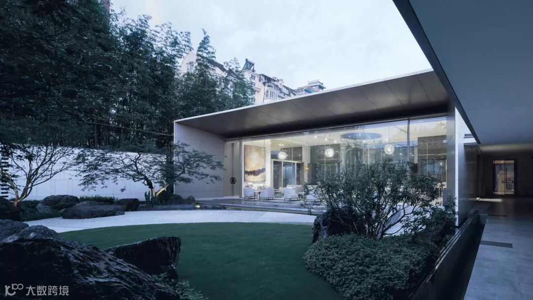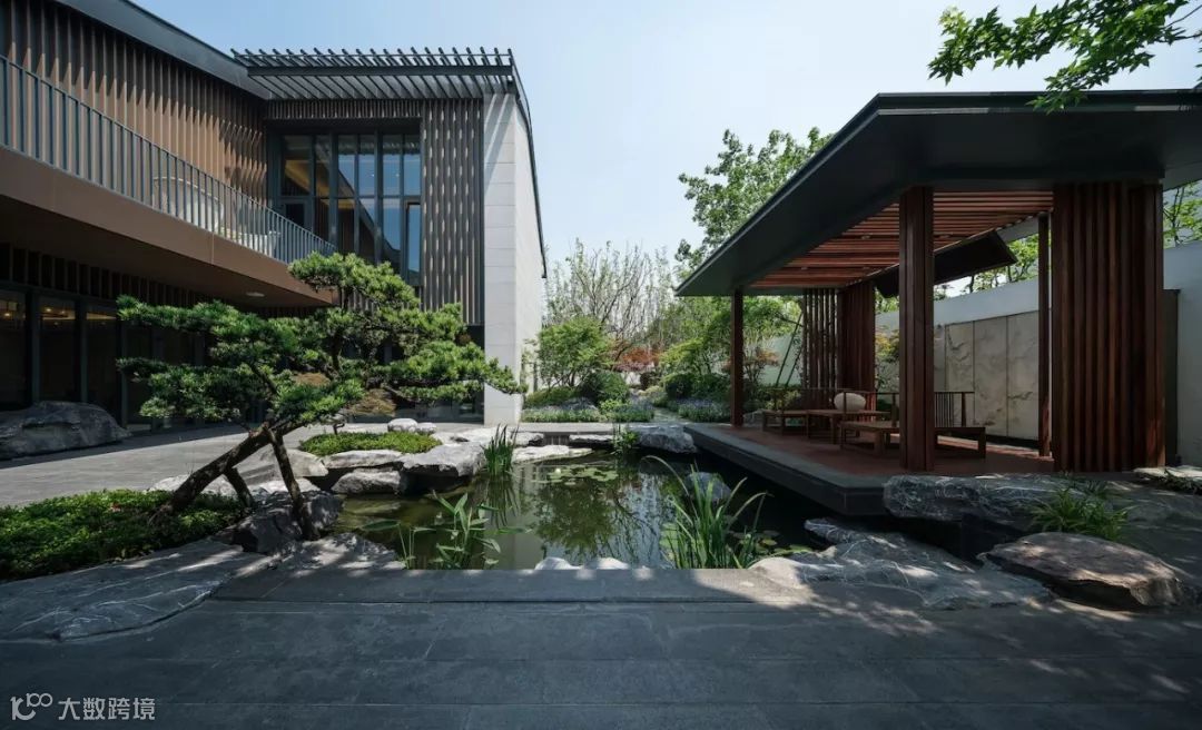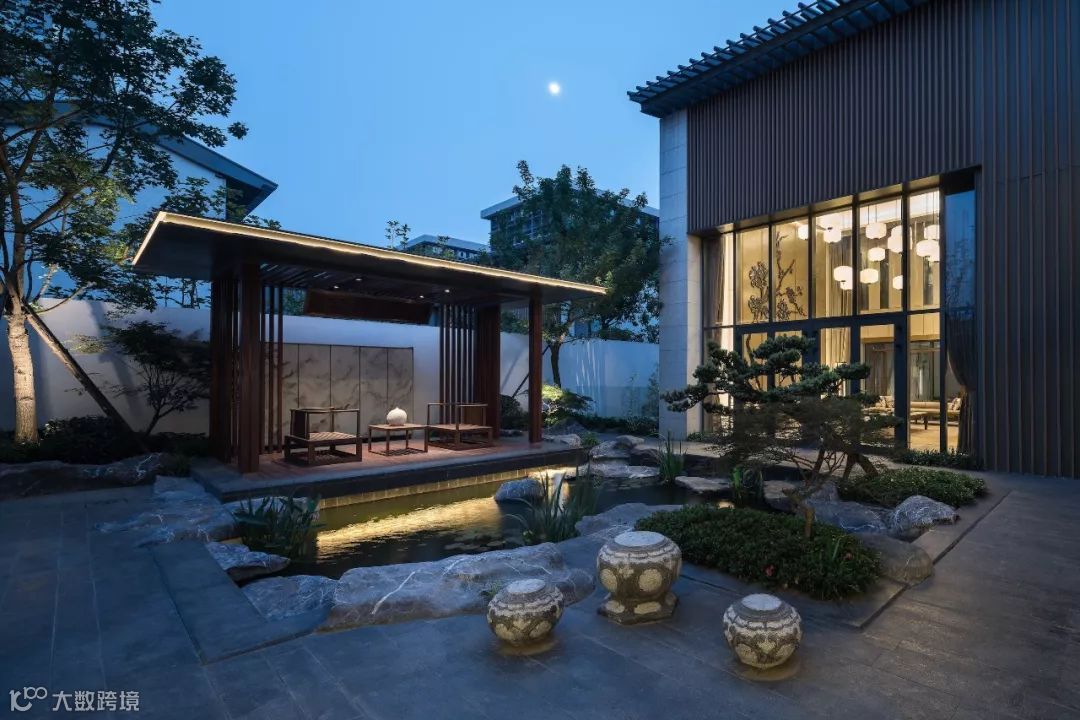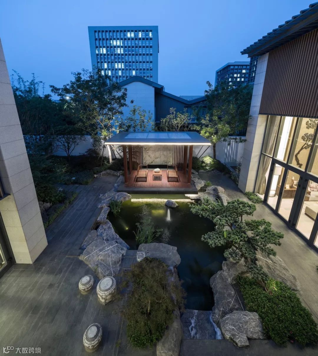 步入中庭,则豁然开朗,设计构建怡情山水间的品质,亦满足主人独坐静思,交友闲谈的生活需求,场地适当留白,可做室外款待。