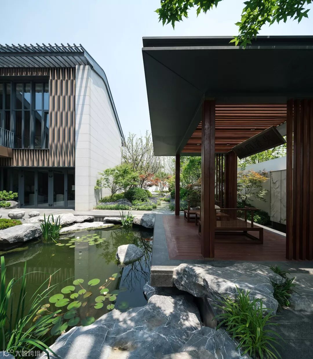 本样板院位于南京九间堂一期东南角,景观团队从金陵画派与寄畅园秉礼堂中提取灵感,使样板庭院兼具南北之长,于风雅中得见高贵。着重打造起承转合的的景观节奏,在步移景异间营造丰富的视觉体验,强调“言有尽而意无穷”。