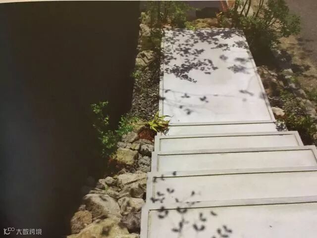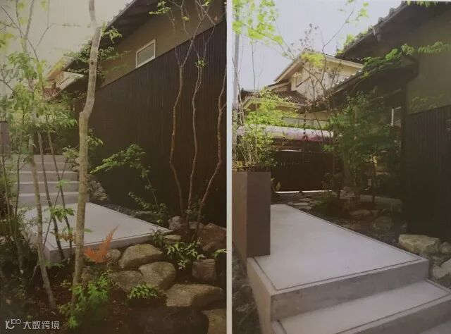 通道尽头和台阶的两旁分别使用了石材,以自然石和砂砾为主要造园元素,并在其中栽种了一些绿色植物,使通道不显得那么单调。