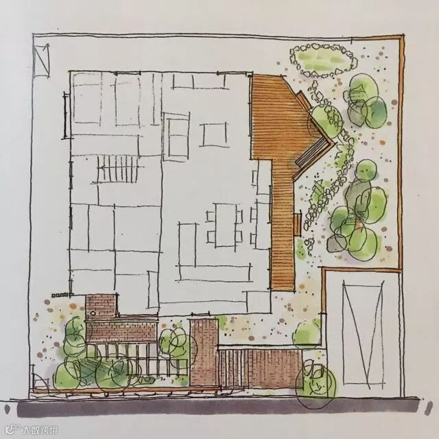 从上往下看,建筑正面是一个敞开式的庭院,为了设计成枯山水庭院,全部以砂砾代替水泥地板,砂砾表面虽然没有圆形和长条形的纹理,但数块大小不一的石头点缀在一片砂砾之中,看上去耐人寻味。