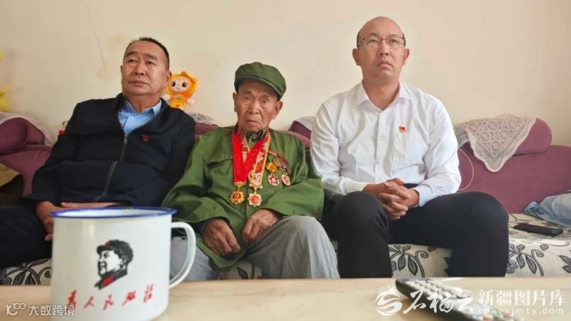 百岁老军垦白玉伦在家人的陪同下观看新疆维吾尔自治区成立70周年庆祝大会。图/一团金银川镇新闻发布平台提供