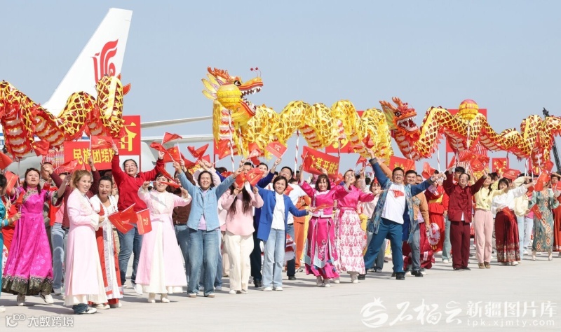 9月23日,自治区各族群众代表身着节日盛装,挥动红旗和五彩花束,欢迎总书记的到来,表达对总书记的衷心祝福。石榴云/新疆日报记者 崔志坚摄