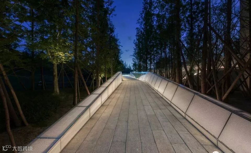 折桥是原有的水上结构,设计难点在于如何在荷载的约束下塑造出水上构筑物的灵动特质,设计团队选择用覆膜白玻璃和冲孔板结合的轻质表皮结构替代绝大部分的桥面扶手栏杆,维护栏杆演变的钢龙骨体系为塑形提供了一定的结构灵活度,与环境明暗调有高度反差的表皮又进一步强化了结构的轻盈质感。