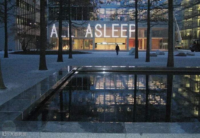 △夜晚,周围建筑的灯光照亮了树林,让珍妮•霍尔泽的艺术装置更为突出。