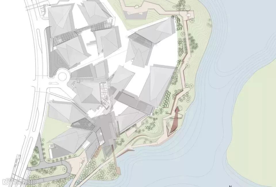 郎酒总部建筑设计风格非常现代,其临湖一侧是连续的自由立面,场地竖向的最大落差超过10米,进深最窄的位置不过20米,相对较窄的陆域腹地尺度、挺拔的建筑体量与开阔的湖面尺度形成鲜明的对比,将对行人产生较为强烈的空间压迫感。设计团队希望能通过景观设计缓和转化这种感受,平衡二者间的冲突感。通过提炼西南山地聚落丰富的步行体验元素,设计团队选择积极对话建筑,呈现一系列转折形态的路径和界面,也因此确定了“折线公园”的名称。