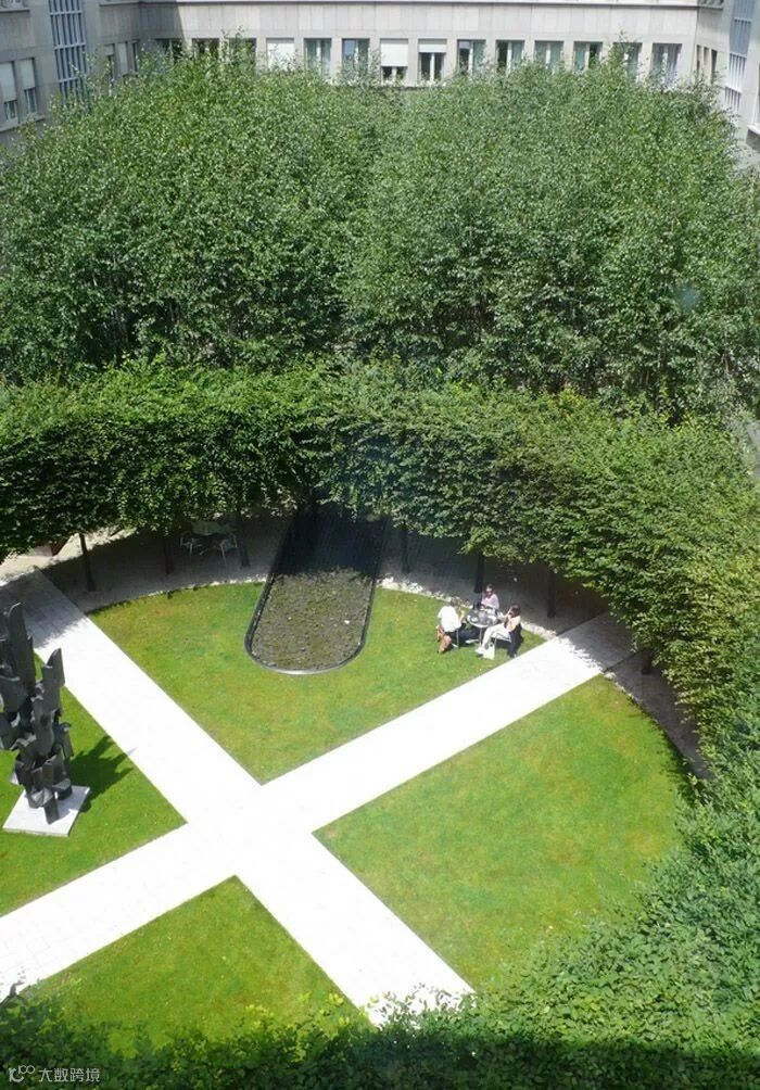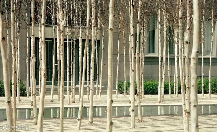 △欧洲鹅耳枥围成一个开放的草坪,白色大理石小路将建筑物与桦树林连接起来。