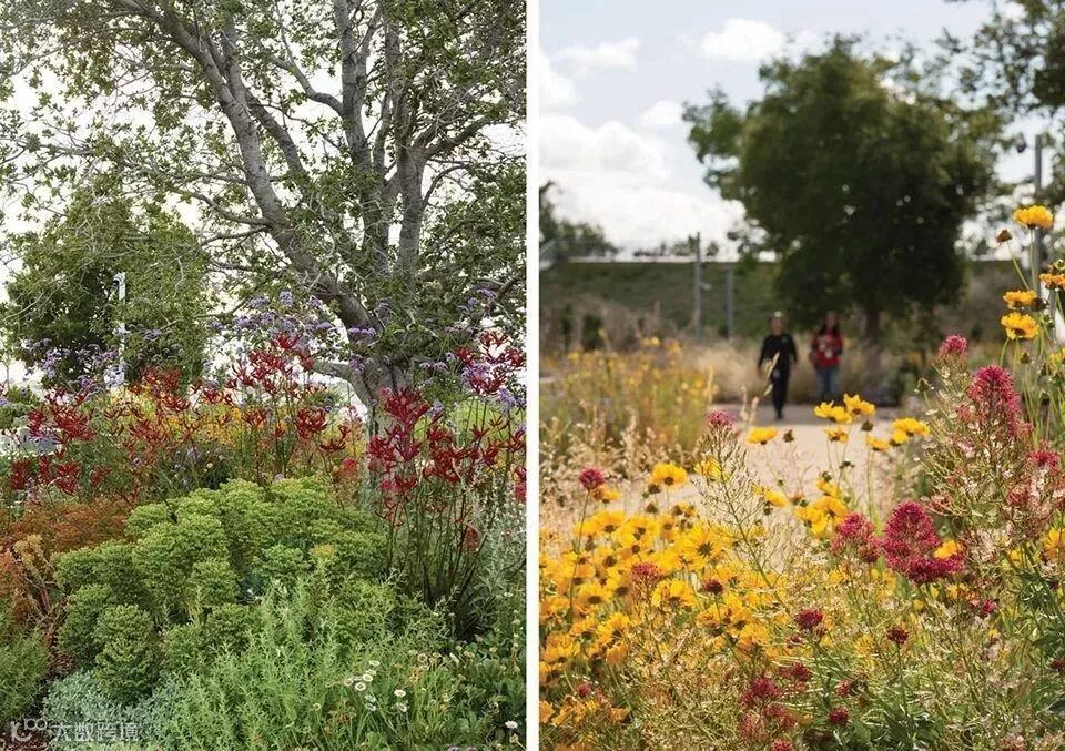 △沿海鼠尾草、针草坪、石兰灌木和鼠李花园搭配河岸下层植被和本土橡树,共同形成了兼具生物多样性和美感的丰富环境