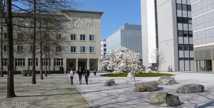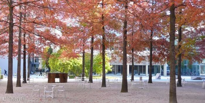 △早春,先花后叶的植物先开放,而这时乔木的树叶还未发芽。员工穿过论坛广场时,员工的心情从冬天变成春天。艺术作品由Ulrich Ruckriem提供。
