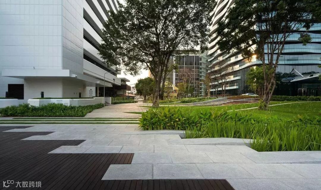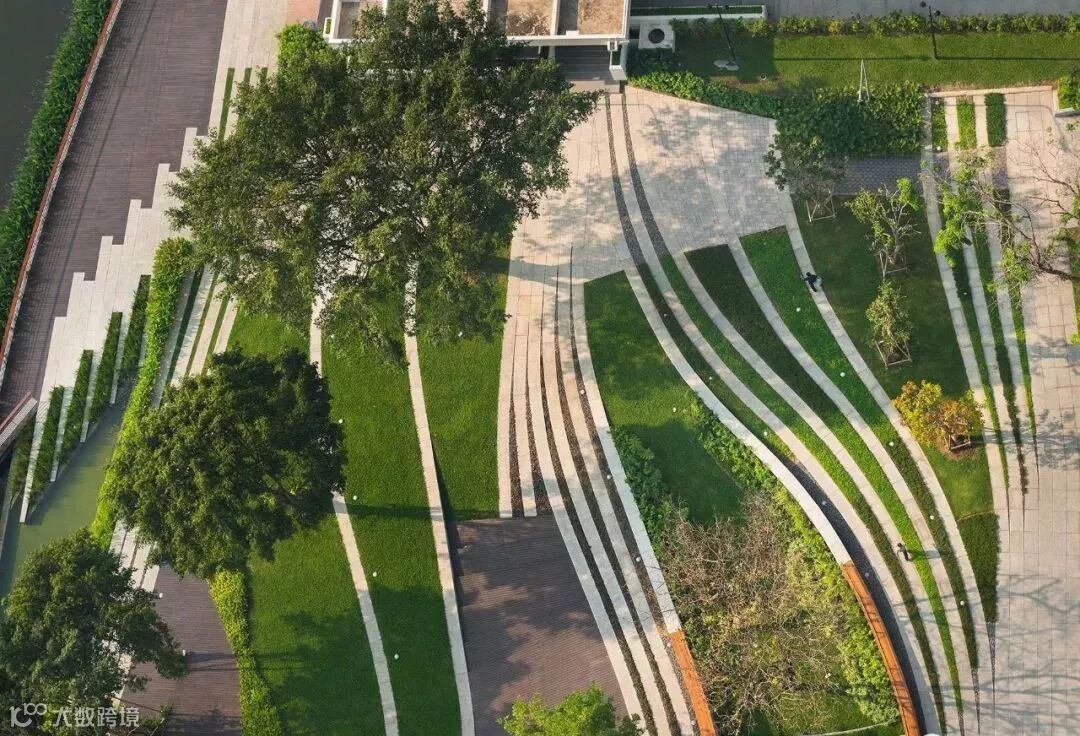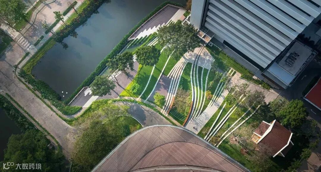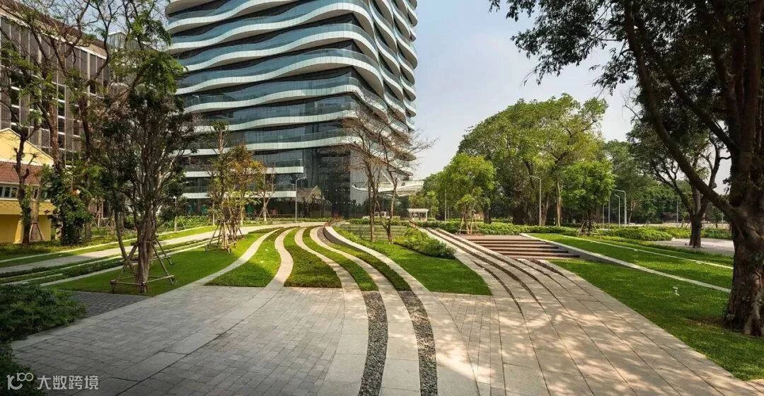 SCG曼谷总部办公景观是由泰国LAB设计,设计贯行可持续的绿色景观设计理念,场地所有的树木都被保存下来。受建筑语言的启发,设计采用平滑的曲线来平衡和协调现有建筑和位于不同场地标高树木之间的关系,让建筑和各种场地元素得到合理的安排和利用,弯曲的肌理彰显自然和人工结构的有机融合。