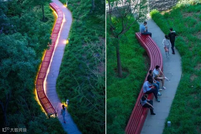 为了能让外部环境和建筑有所呼应,设计师提取了建筑立面的条形元素和“京东红”,进一步衍生出由一系列有韵律和节奏感的条形元素构成的景观基本架构,这一元素被融入整体形态、地面铺装、景墙与城市家具等方方面面。