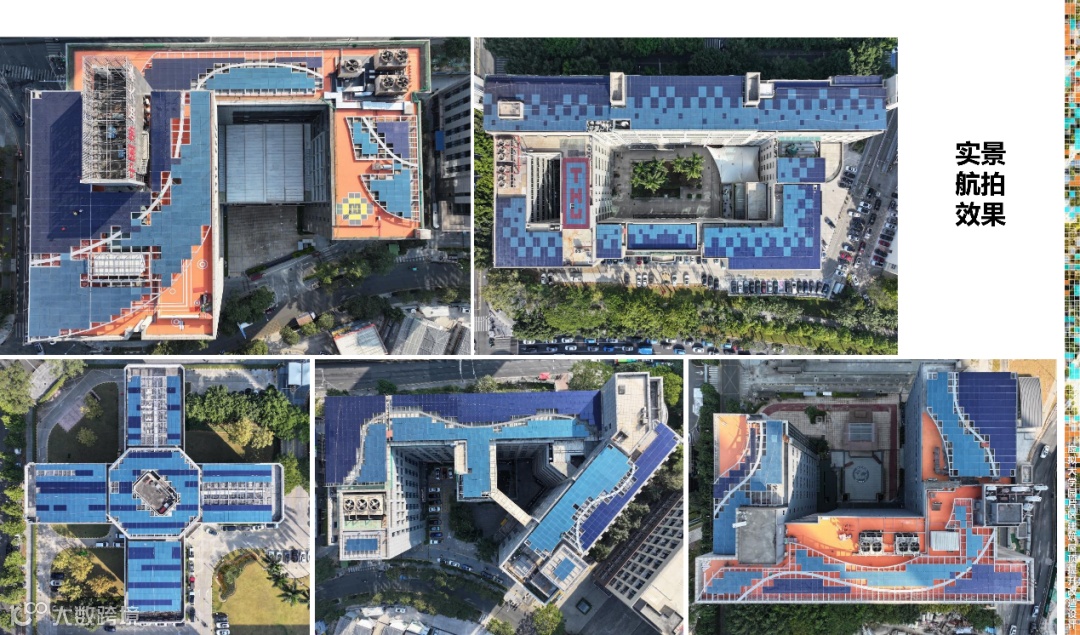 深圳虚拟大学园在深圳城市第六立面提升专项行动的背景下,通过修缮翻新、构架遮蔽、种植屋面、光伏屋面、低空经济等五项措施及艺术概念,以光伏屋面为主导全面提升第六立面的视觉感受及低碳技术,采用单晶硅/碲化镉光伏屋面材料,实现屋面绿能提升的同时唤醒“银河”意象,借数字光格点亮星辰,让建筑既拥抱绿色效能,又流淌艺术诗意,书写城市空间更新与低碳发展交融的诗歌。