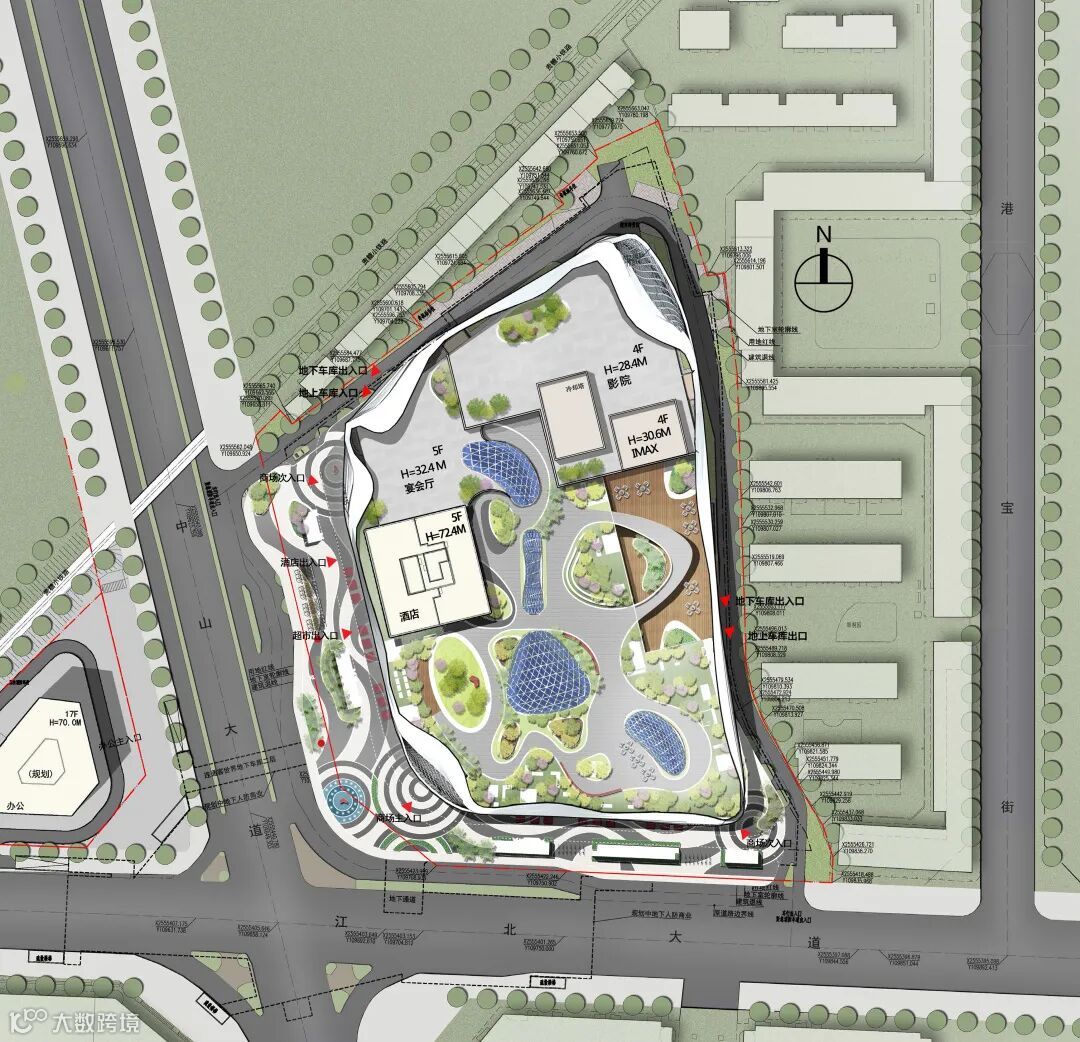 平面布局上,主商业面沿中山路及江北大道设置,并将酒店塔楼布置在沿主干道中山路一侧,兼顾建筑标志性及商业利好性。商场通过几个形态各异的中庭节点的处理,活跃整体商业动线,并实现各层商业竖向联系。影院部分设置在地上四层,通过独立的竖向交通系统,串联各层商业及停车库,并设有专门的散场通道,与商场部分既分且合、互不干扰。超市位于地下一层,通过设置专门的超市接待大厅引导购物人流,并与地上商场部分、地下车库部分紧密衔接。