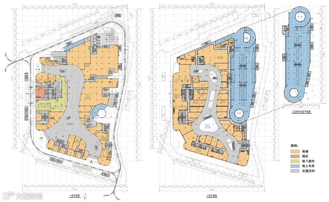 商场二层、三层设置局部地上停车库,与商场部分实现横向衔接,同时达到减小商铺进深,保证商场人流动线简洁明确的效果。商场通过几个形态各异的中庭节点的处理,活跃整体商业动线,并实现各层商业竖向联系。