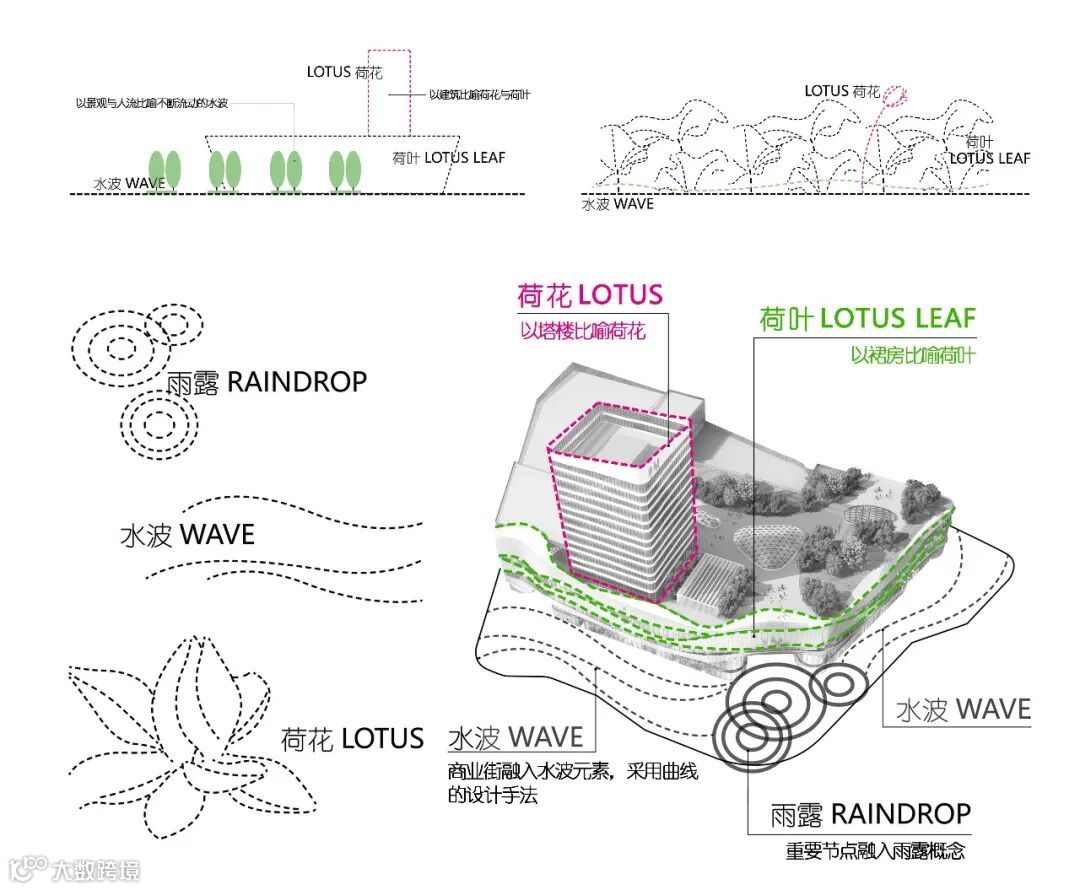 以景观与人流比喻不断流动的水波,以塔楼比喻荷花,以裙房比喻荷叶。