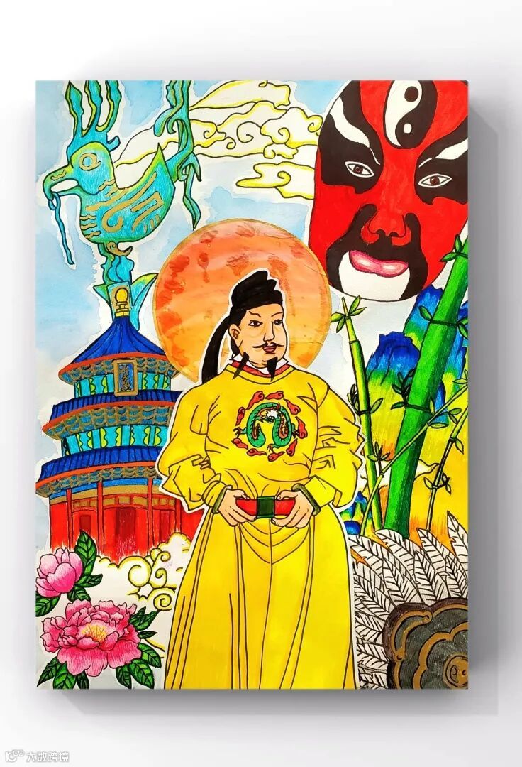 作品简介:唐太宗骑着祥云、带着诸葛亮的羽扇、京剧的脸谱,领着代表中国的文物、古建筑、国花、竹林和山川走向世界!