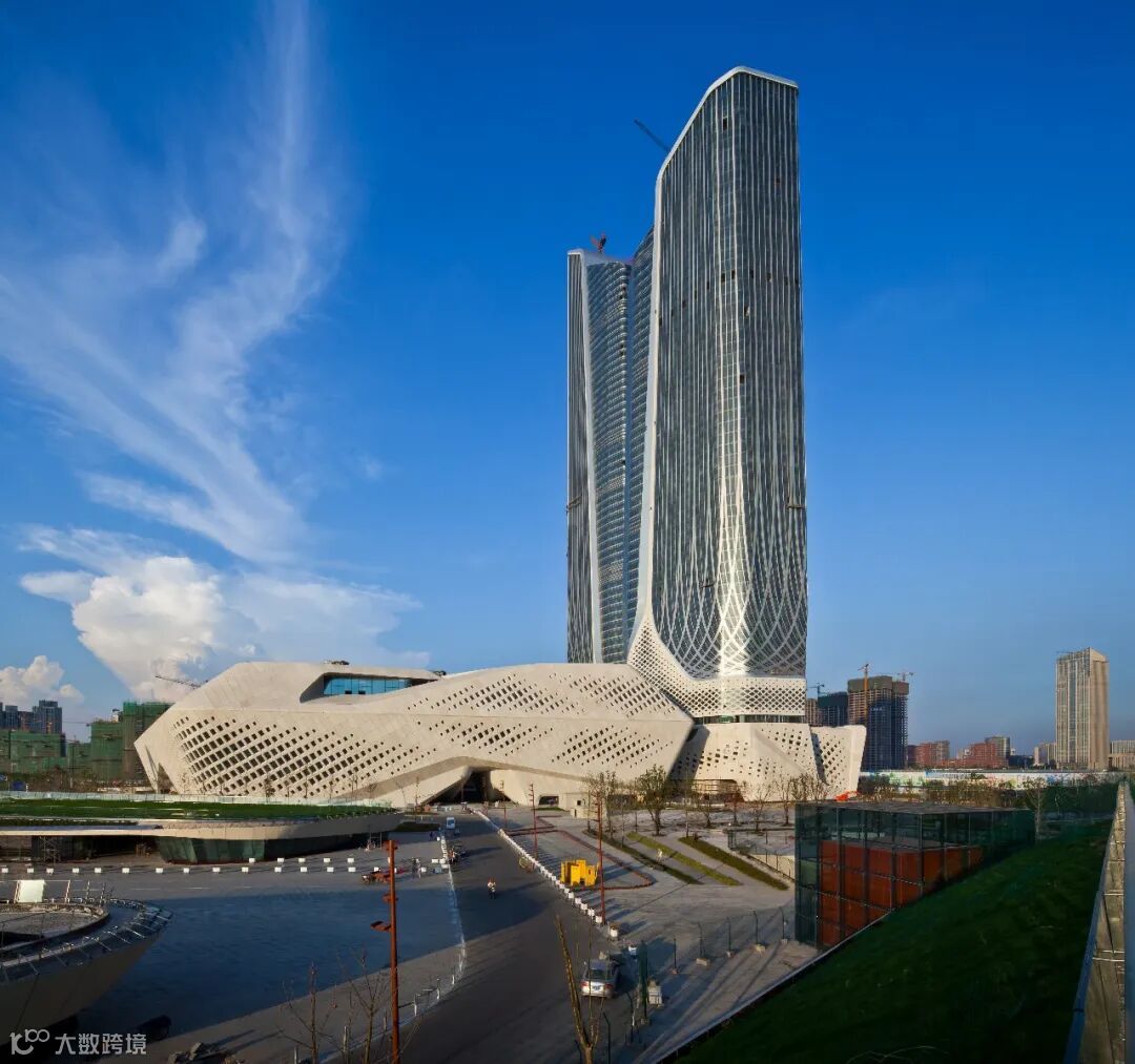 项目是华森与奥地利蓝天组合作完成。方案产生于——块半透明的“城市巨石”意向,经历飓风般的局部扭转而成。建筑地上6万平方米,地下2.8万,顶部高度48米。当代艺术馆和城市规划馆布置在同一个建筑里。两馆中间是建筑最有趣的部分,一个连接两展馆兼具公共交通和休闲空间的雕塑体—云雕塑,通过空中飘带与两侧的当代艺术馆、城市规划展览馆连接起来,空中的飘廊和无柱空间创造了优美的异形空间体验。整个建筑通过六个巨柱支撑起来,六个巨柱内部都是交通核。建筑的地下层是馆藏、停车;一层、二层是特展厅和辅助用房,三层到五层是正式的展览空间。建筑本身的功能并不复杂,但各层楼板扭转、再披上双扭面的外表皮之后,形体就变得异常复杂。