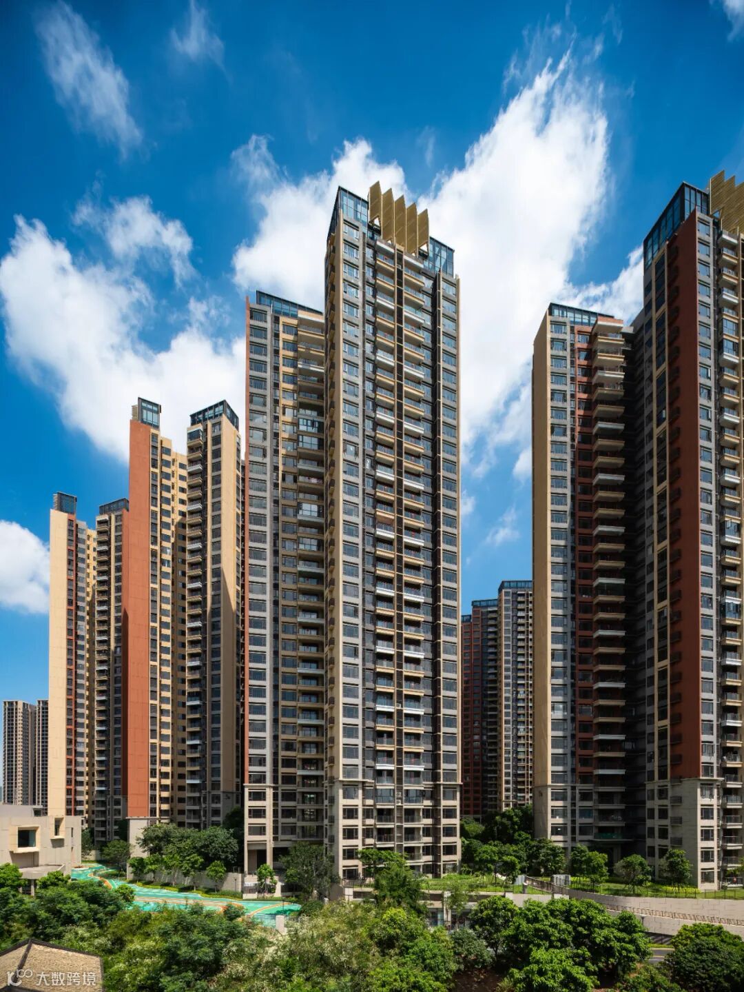 延续星河传统立面风格,强调现代感、挺拔感、明快感。本期立面设计,增加沿街视角立面的特殊设计,使得每个视角色彩红黄交替出现,每栋塔楼都有独特的色彩搭配,增加黄色部分的比例,使整体效果更加明快。