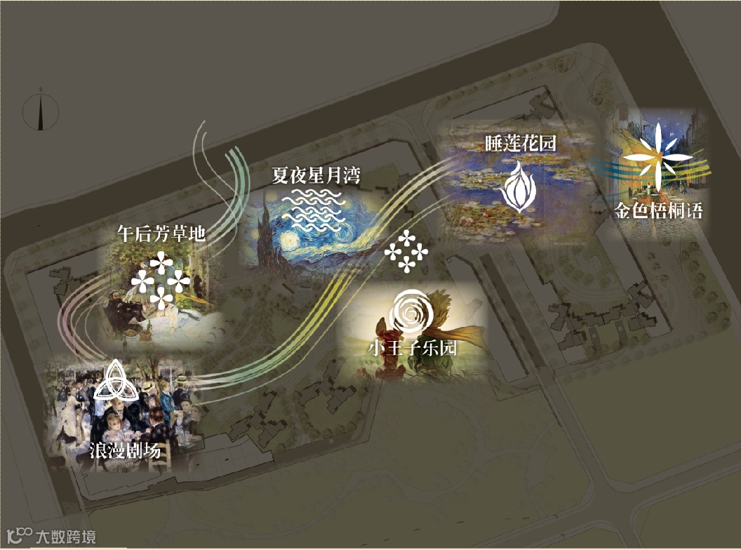 以“印象派园林”为设计概念,采用曲线硬质铺装、丰富的植物群落,主题性的具象雕塑等打造各主题园区氛围。