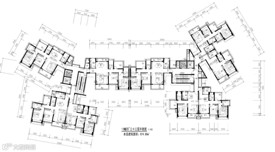 各户型在保证间距的前提下分别扭转一定角度,建立视线通廊。户户可享有近处的大庭院景观和远处的自然风光。北侧享有院景,南侧有体育公园用地景观和淡水河景观,大户型主要靠近南侧布置,机翼户型全部做到南北通透。小区一共由13栋楼,17个单元组成,归纳后为4种单元,5种户型。