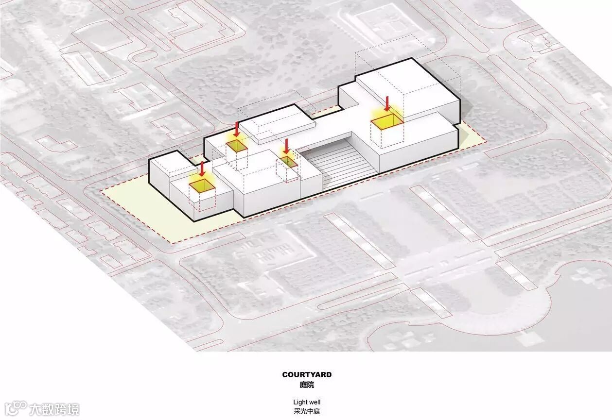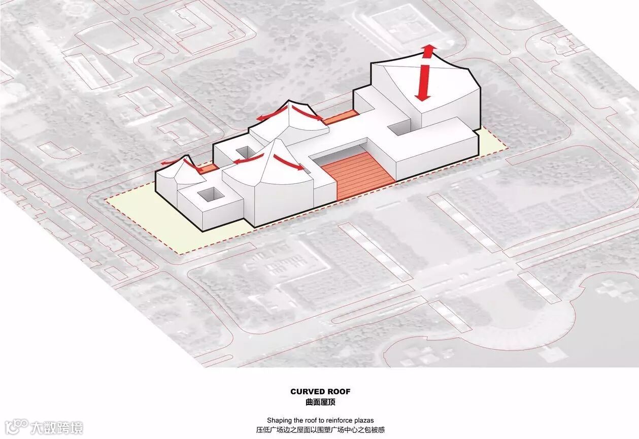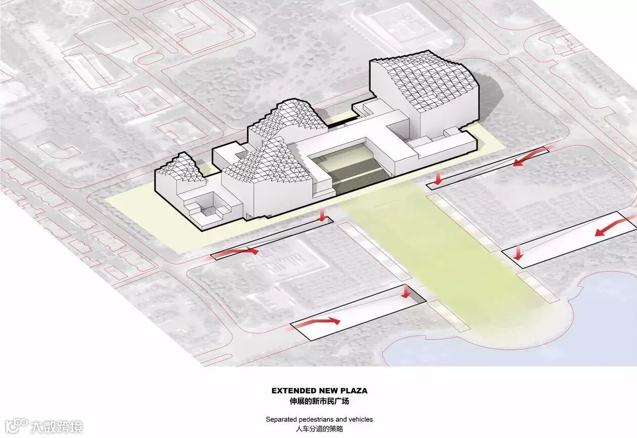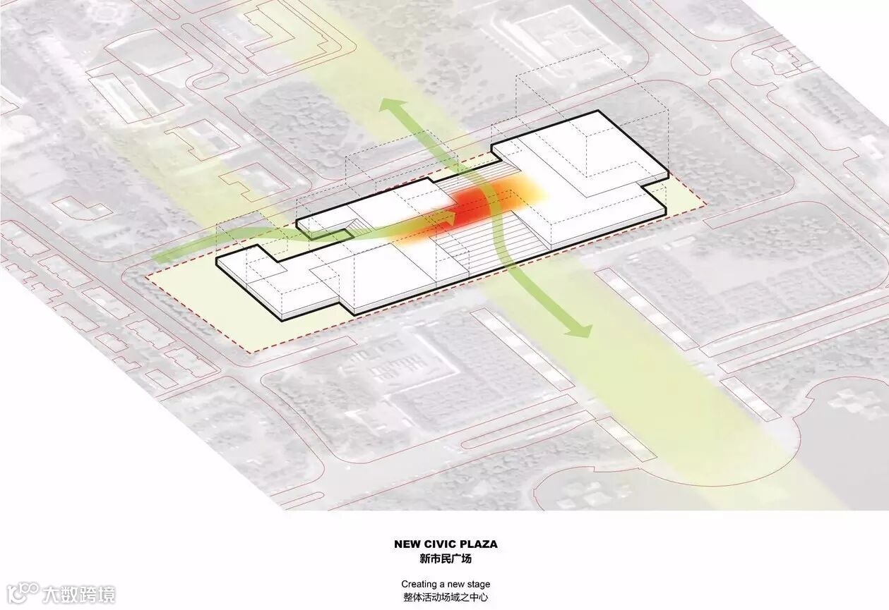 基于这样的理解,以及对于基地城市纹理之对话,我们梳理出,南海文化中心之 中心区域,应是一个二十四小时开放给当地居民大众之“空”的,通透但却有遮蔽的市民广场,文化中心的中心区域完全回馈给市民,才是真诚的建筑答案。