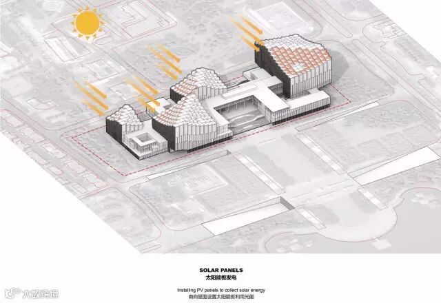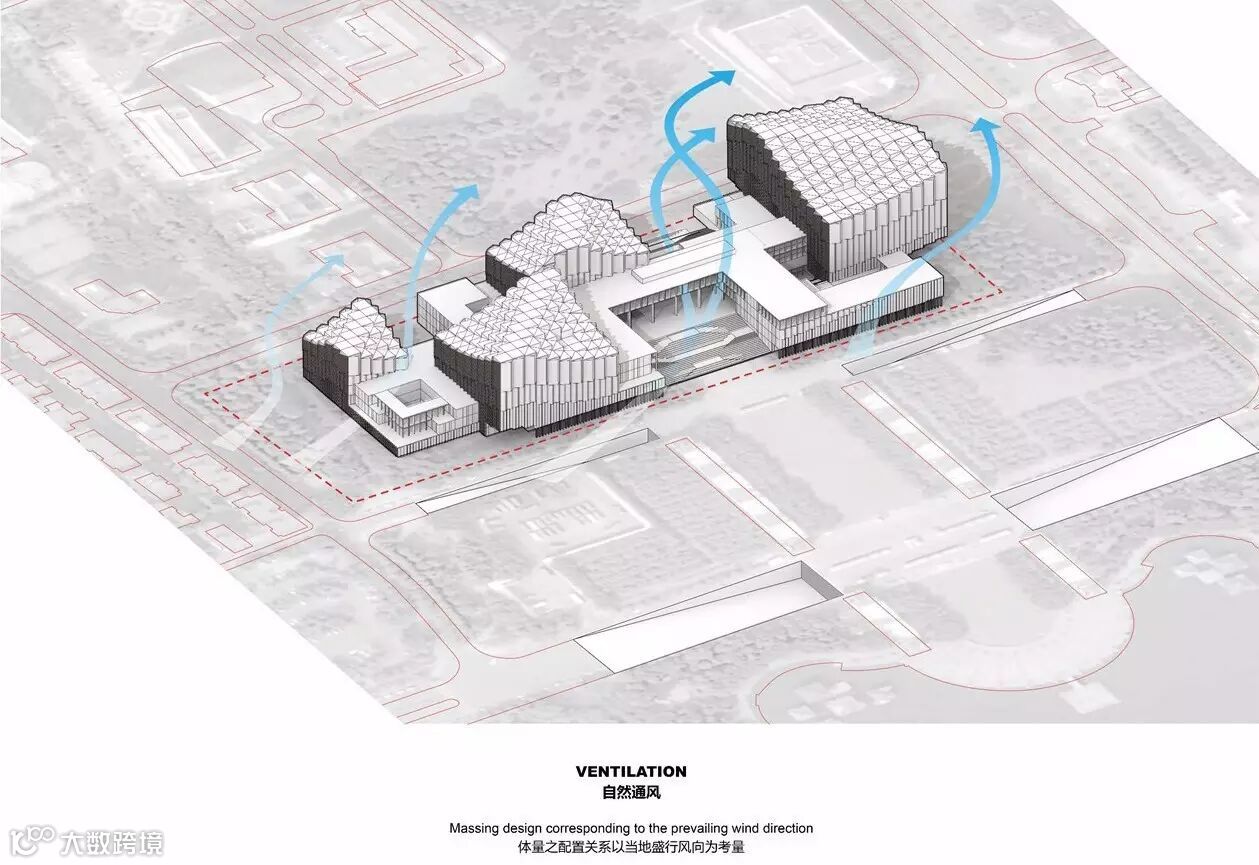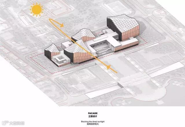 开放的、新的通透之市民广场概念确定了,这样的通透之中心思想便随之贯彻 整个规划设计。南海文化中心需要的不是一个巨大集中之建筑单体,而应该是单元化 的、尺度合宜的,能让当地吹的东南向风顺畅地拂过,能让炙热的阳光不会肆无忌惮 地加诸于居民及建物,具连廊骑楼形式之遮蔽空间,以及小心反应太阳日照角度的立 面处理方式,理解先人之智慧来处理建筑执行上之细节,才真的是能以最经济有效率之方式达到永续生态之节能建筑,也是我们执之为守的信念。