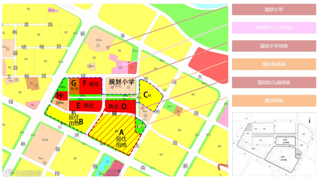 用地位于南京市雨花台区中船绿洲一期地块内,规划范围为A区和D区两个部分。A区是住宅用地,用地面积66031平方米,容积率为2.9;D区是保留工业厂房的商业用地,占地面积17715平方米,容积率为0.7。