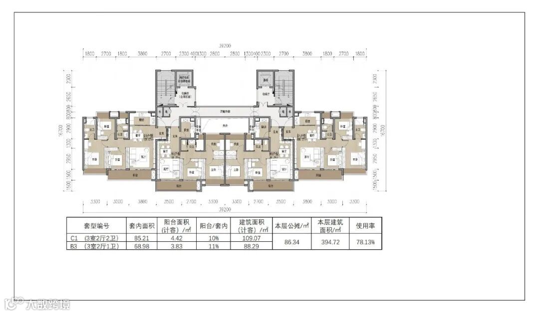 小区共14栋21层到34层的高层住宅建筑,其中一梯四户商品住房9栋,一梯六户商品住房5栋。单体楼栋平面布局均为正南向;楼栋采用全明、开敞、通风的核心筒公共空间设计,提高住户归家舒适度;合理布局独立的入户走廊空间,提高归家仪式感。户型设计以大面宽结合飘窗,最大化的利用周边和庭院的景观资源,争取更多采光通风,营造舒适的居家环境。同一梯户比的户型产品采用统一的核心筒,搭配不同面积段的标准户型,拼合为标准层平面,减少差异化,降低预制构件种类,便于设计和后期施工。