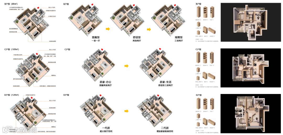 室内通过家具进行隔断,可以对空间进行灵活划分,通过可生长的弹性空间来满足家庭成长性需求。